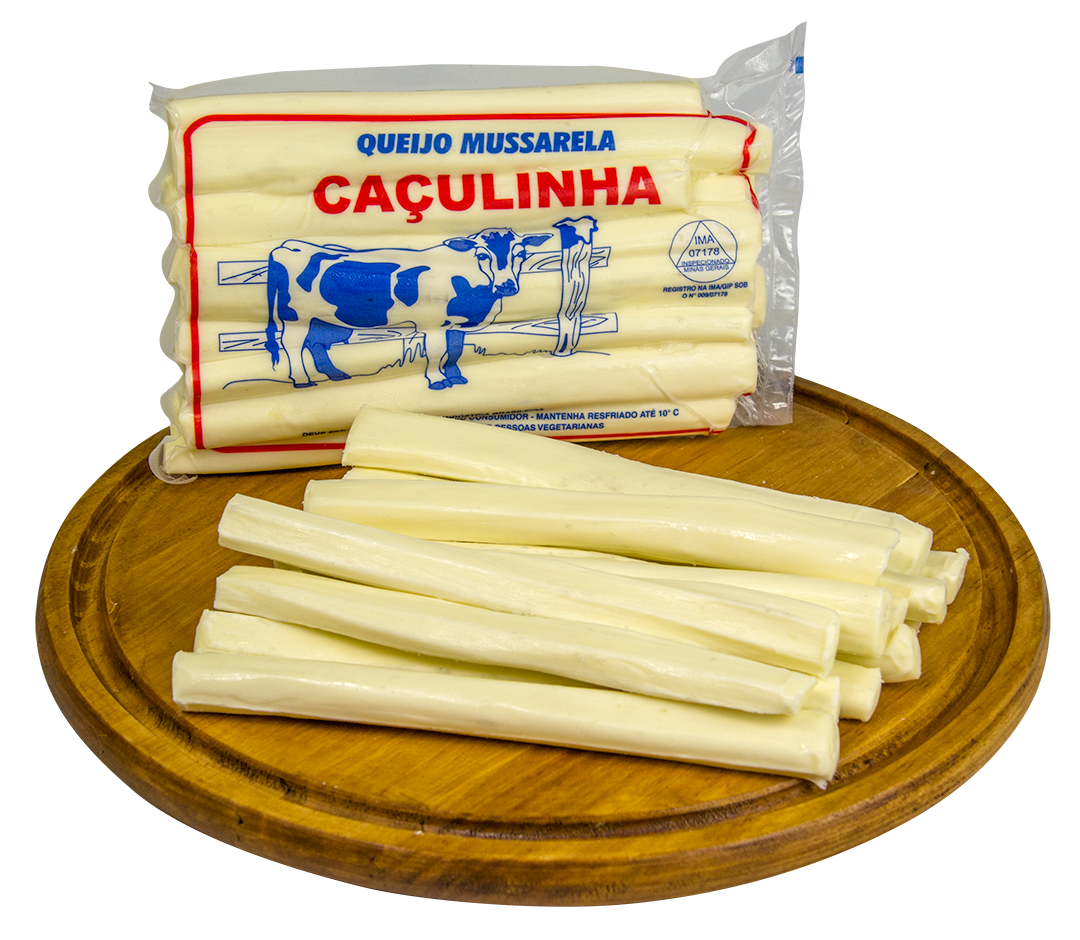 Mussarela palito branca em pacote de 450 gramas.